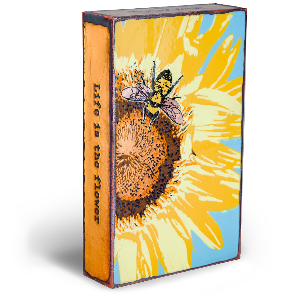 Spiritiles are molten glass on copper Houston's spiritiles capture the spirit of the enlightened moment, and share that moment of light with the world. The stories borne on their golden sides are timeless words of wit and wisdom...those AHA! moments of life. Spiritiles are hand painted on copper in finely ground glass, then fired by kiln at 1500 degrees. It's like drawing with sand, Houston says, then toasting it on a very hot fire.