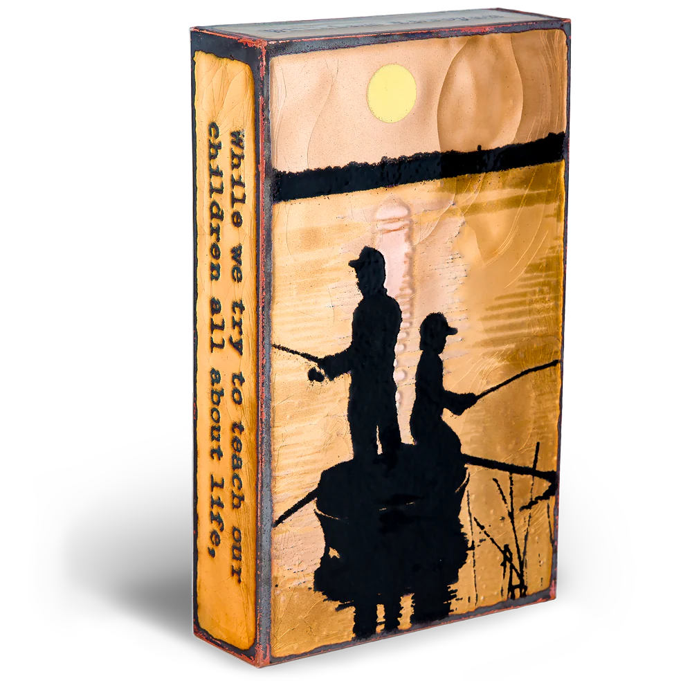 Spiritiles are molten glass on copper Houston's spiritiles capture the spirit of the enlightened moment, and share that moment of light with the world. The stories borne on their golden sides are timeless words of wit and wisdom...those AHA! moments of life. Spiritiles are hand painted on copper in finely ground glass, then fired by kiln at 1500 degrees. It's like drawing with sand, Houston says, then toasting it on a very hot fire.