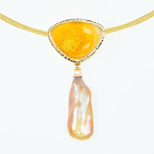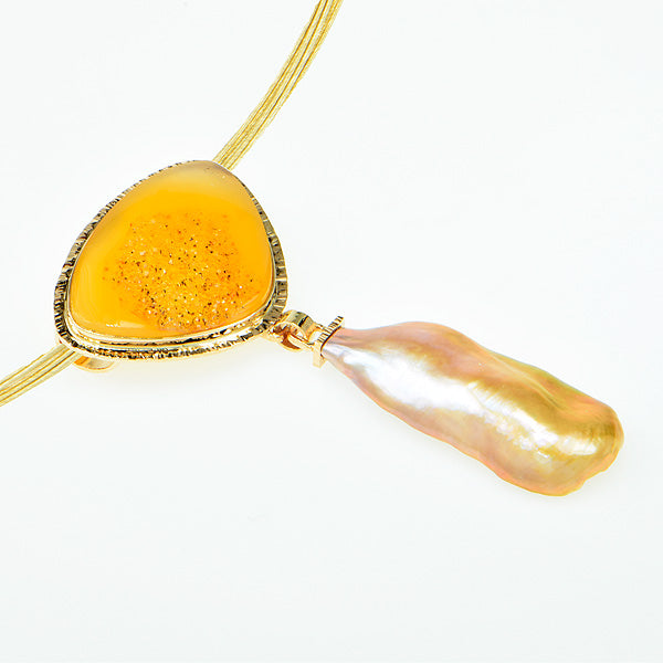 Amber Drusy Quartz with a polished surface and speckled crystalline surface, and a natural color Amber Free- Form Freshwater pearl, unusual colors for both. Bezel setting, with hammered texture frame.
