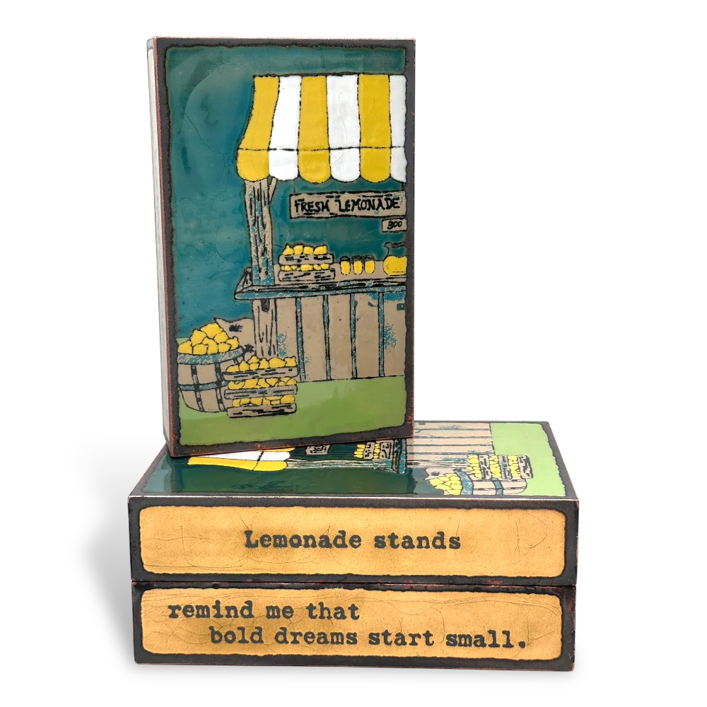 Houston's Spiritiles capture the spirit of the enlightened moment, and share that moment of light with the world. The stories borne on their golden sides are timeless words of wit and wisdom...those AHA! moments of life. Spiritiles are hand painted on copper in finely ground glass, then fired by kiln at 1500 degrees. It's like drawing with sand, Houston says, then toasting it on a very hot fire.