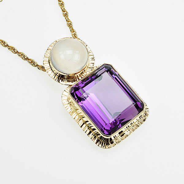Large emerald -cut Amethyst with dazzling color, throwing off purples and blues. Large Catseye Moonstone. Bezel setting, with hammered texture frame.
