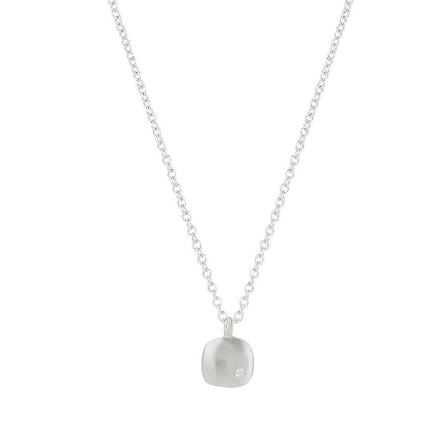 Small puffy square w. diamond. silver necklace pendant hangs approx 1/2" on a 16" cable chain w/ extender. 5801sn. gold. Findings are sterling silver.