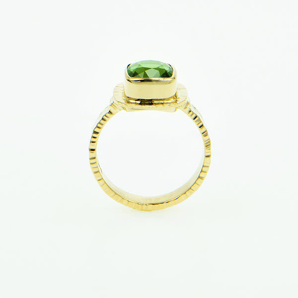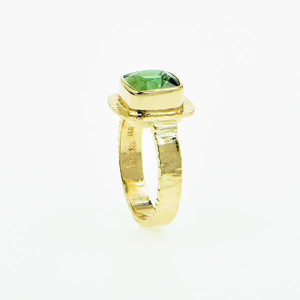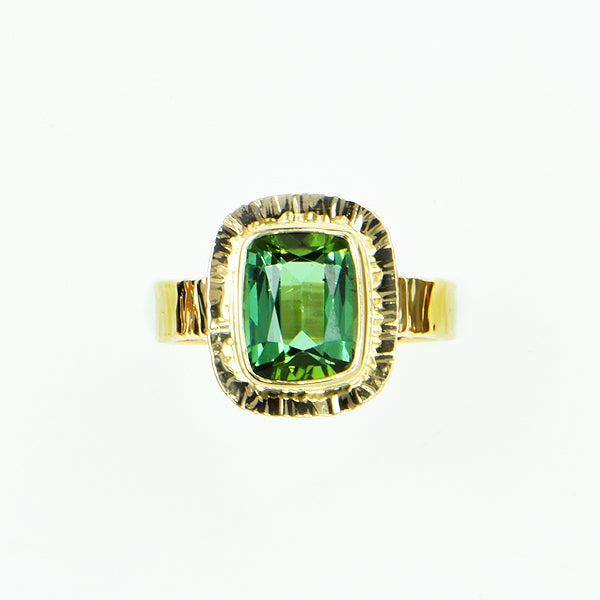 Afghan Green Tourmaline is cushion cut and emerald color. Bezel setting with hammered frame, forged band, hammer textured on three sides.