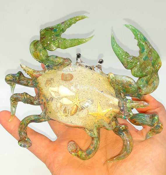 This crab's shell is hollow blown glass that holds sand, shell, and starfish from the beach. Colors are added while the glass is molten then manipulated and blown into shape.