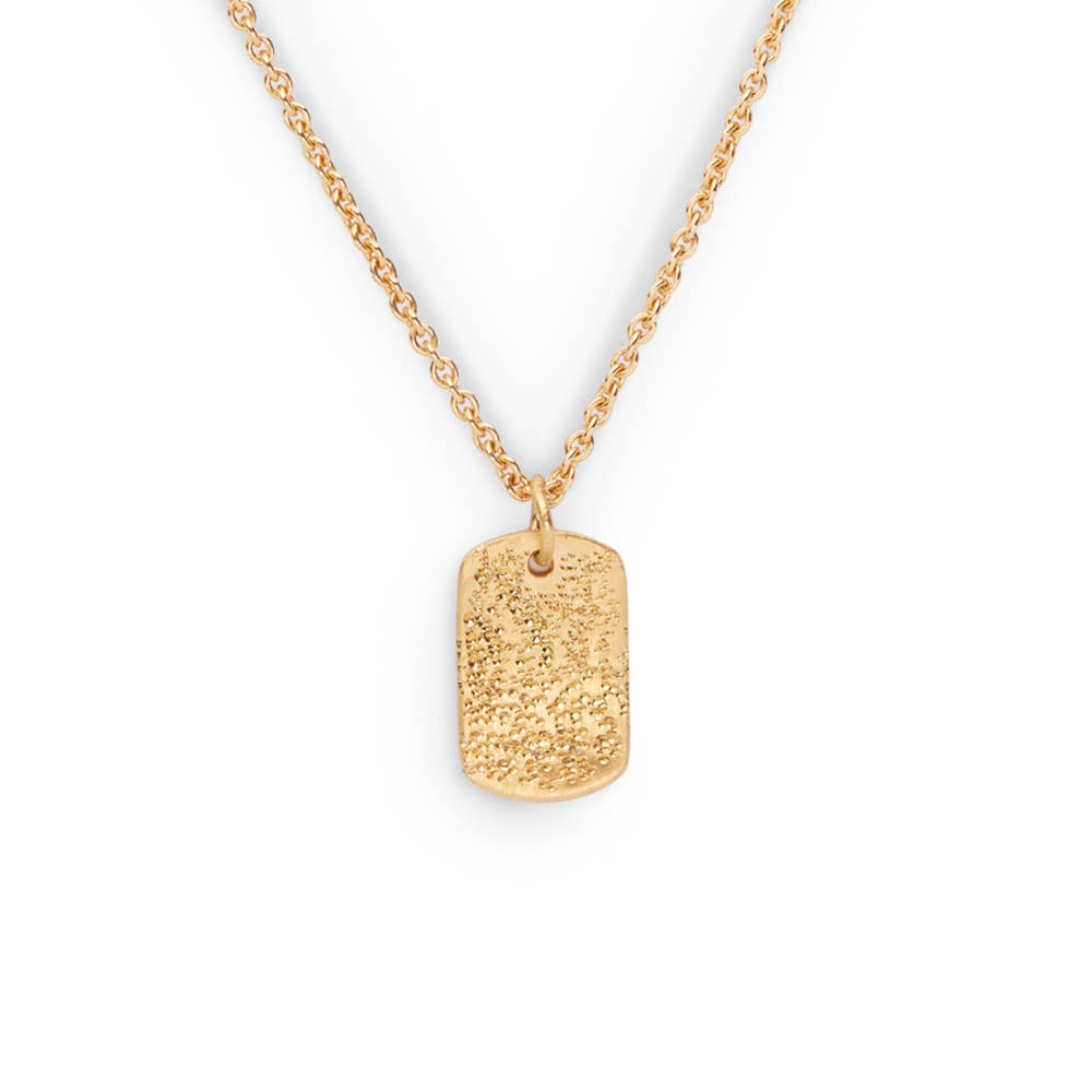 Tiny yet impactful, the Diamond Dusted Mini Tag necklace is a feminine take on the dog tag necklace. Diamond dusted is a texture carefully applied by hand, by striking the metal with the back, pointy side of a diamond. Creating a beautiful, subtly sparkly finish. mini tag measures 1/2" long x 5/8" wide 16 & 18" adjustable chain s hook closure handmade with love in our Georgia studio STERLING SILVER | solid sterling silver all the way through GOLD PLATED | 5 micron thick 18k gold plating over a solid brass base all CKD jewelry is nickel free