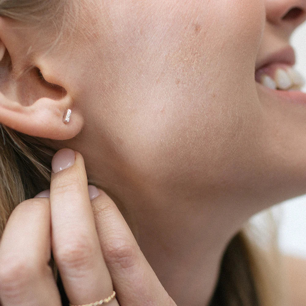 These small earrings are great for a subtle sparkle or second holes. If the diamond dusted column studs are a little too much sparkle, the classic finish is your perfect choice. Take your look asymmetric by mixing one mini stud and one short stud.