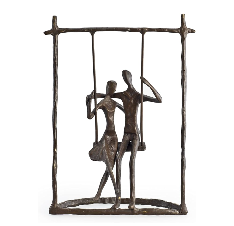 The Danya B. handcrafted cast bronze sculpture of a couple on a swing portrays the power of intimacy and innocent romance. A stunning tribute to the beauty of love, this piece makes an exquisite addition to your home. Plus the bottom is lined with velveteen to protect to keep your furniture safe and sound