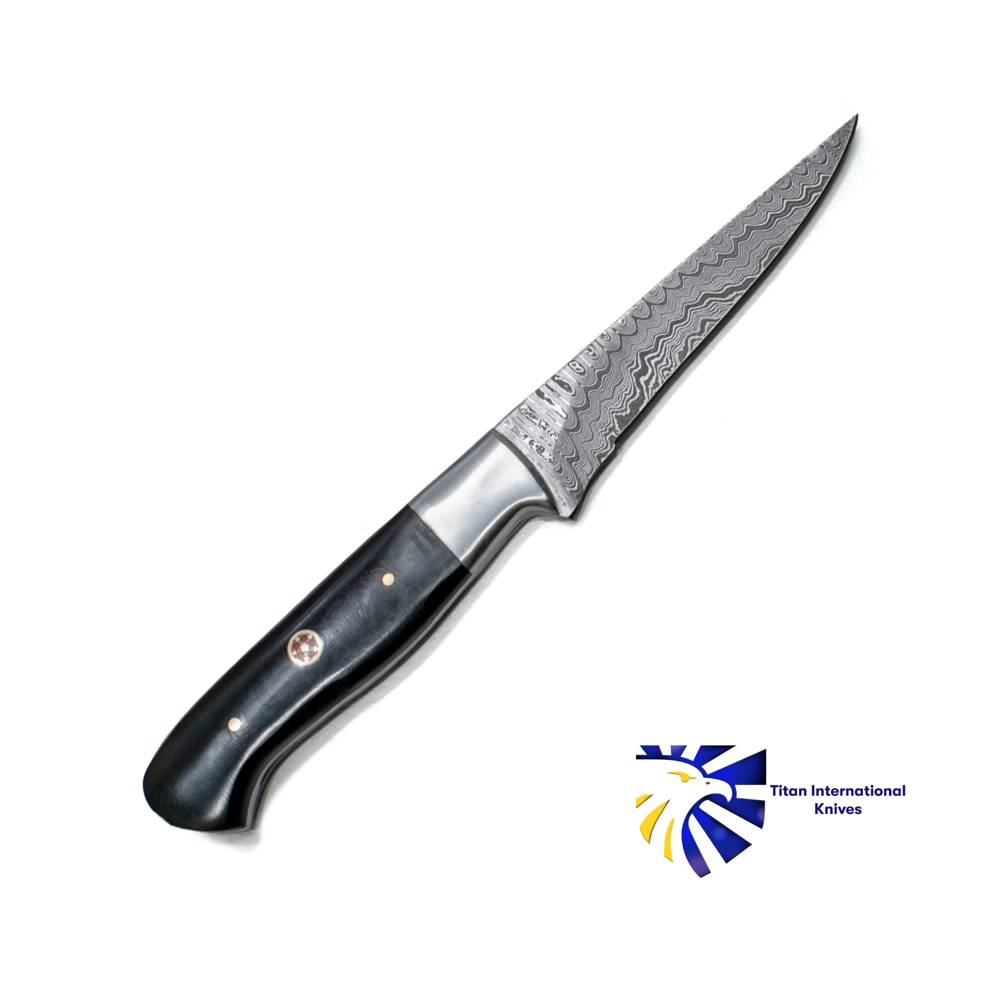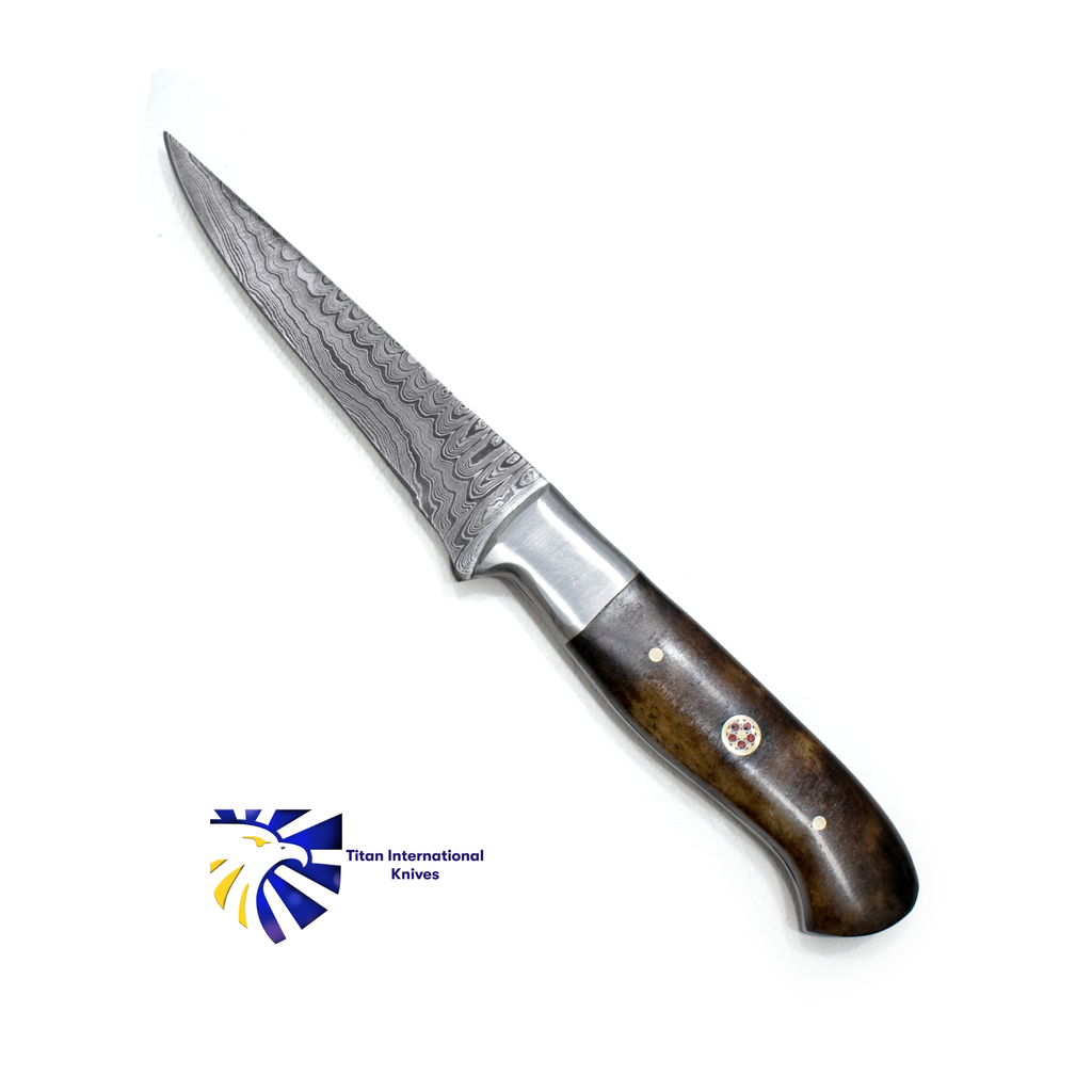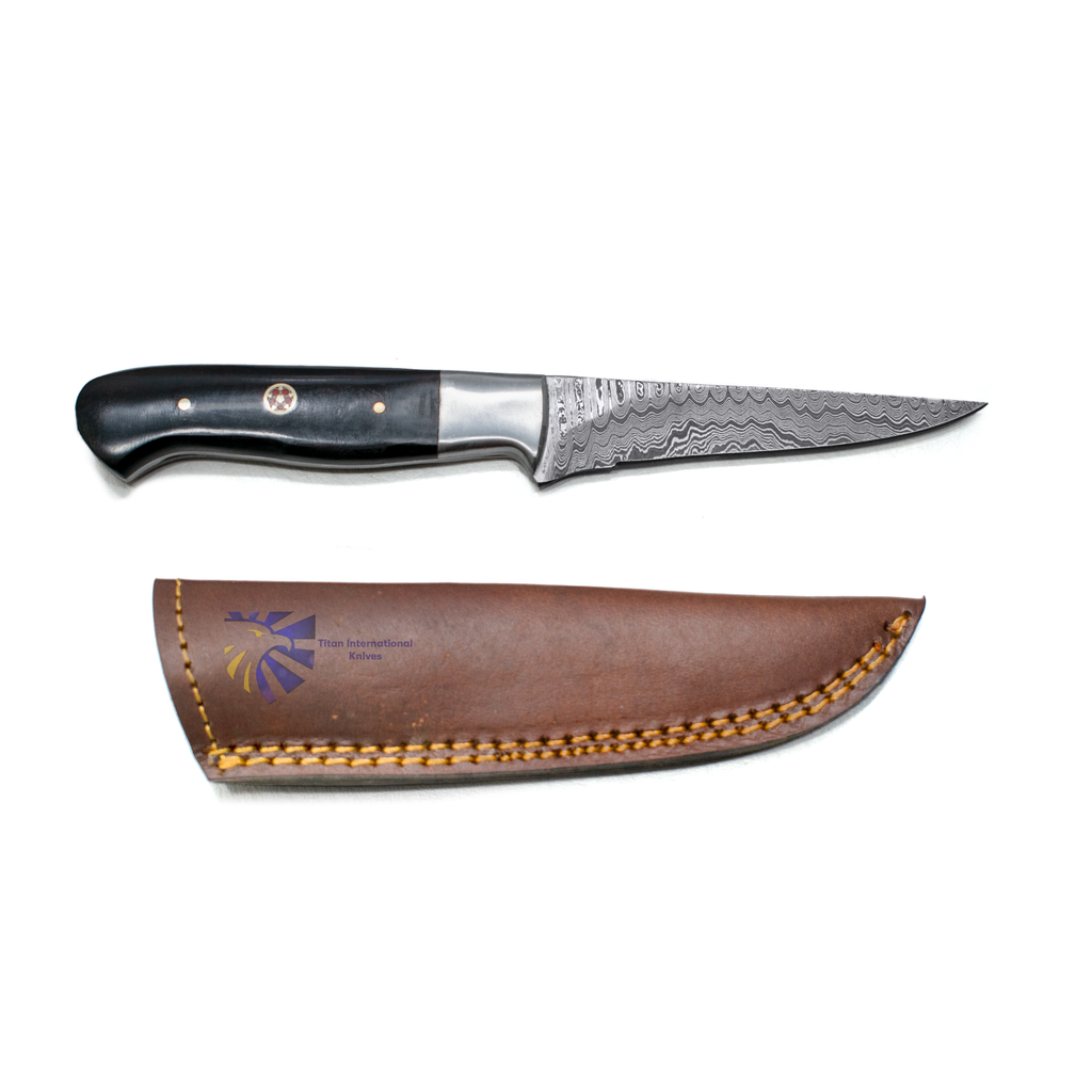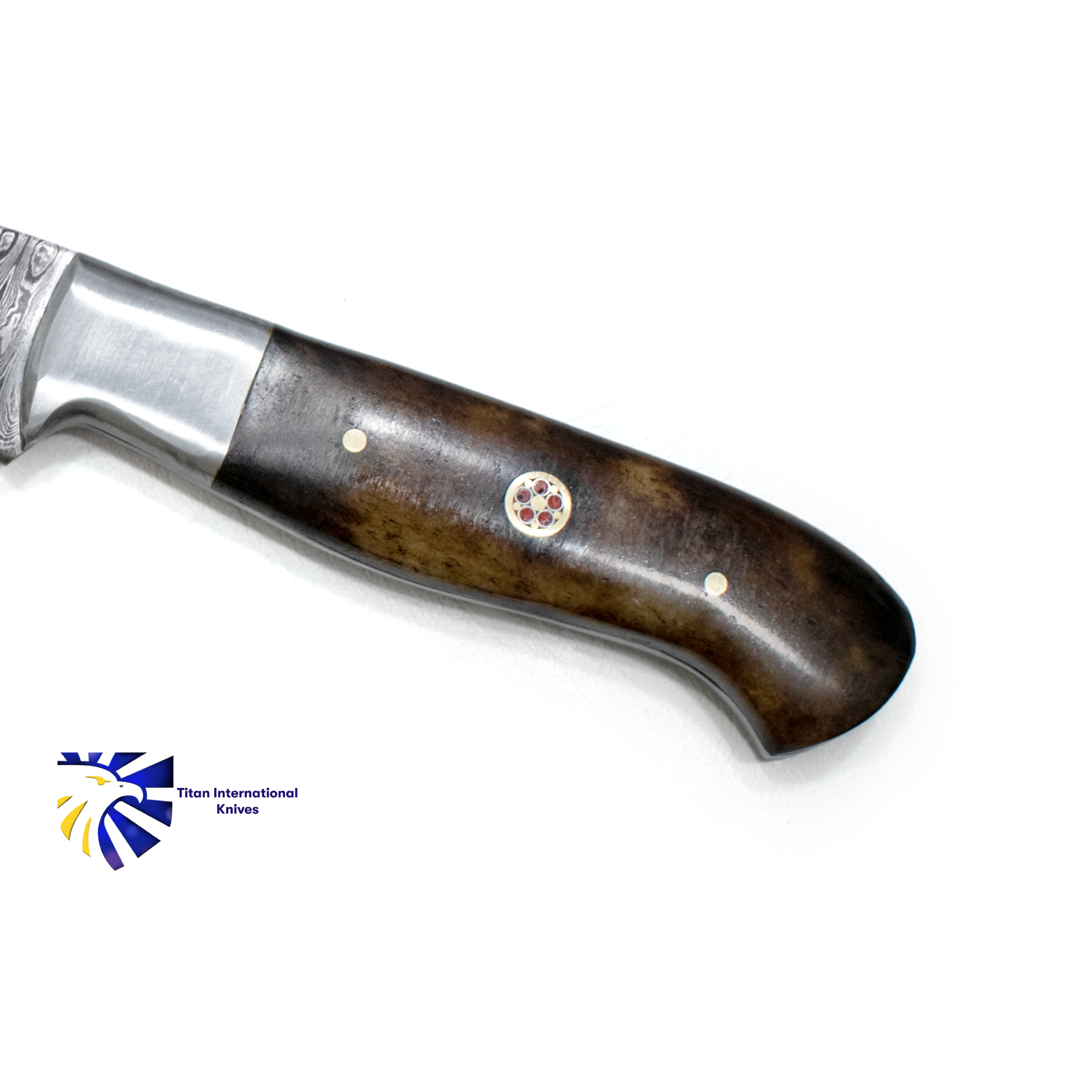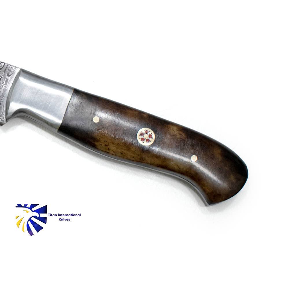 Titan International Knives Damascus Hunting/utility knife is hand crafted to be functional and not just for looks. Utility Knife has many hours of work into it including forging, filing, fitting, grinding, polishing. The Dyed bone scales are locked in place with the multiple Brass pins. The handle has a very smooth grip to it which feels natural when held in the hand. The knife is weighted to have a balance point right where the blade meets the handle. Remarkable workmanship on this knife!