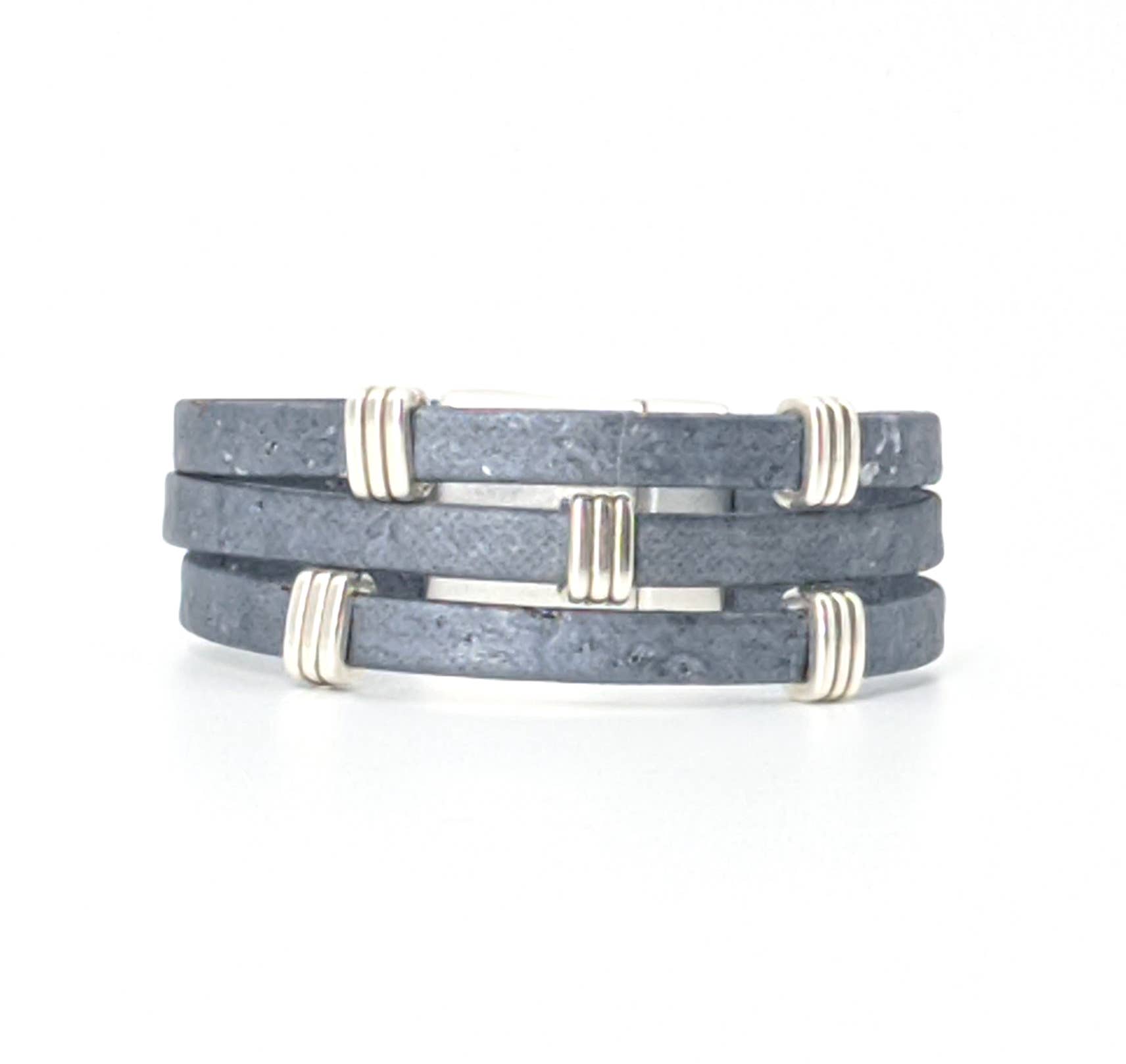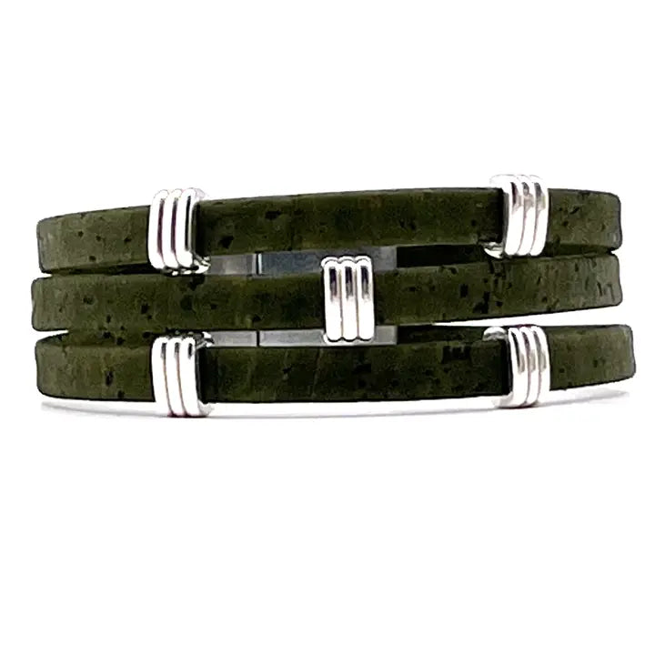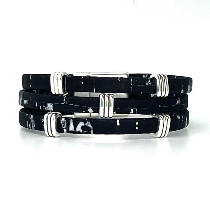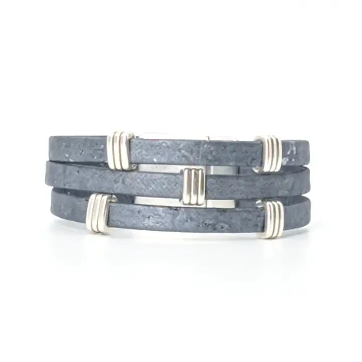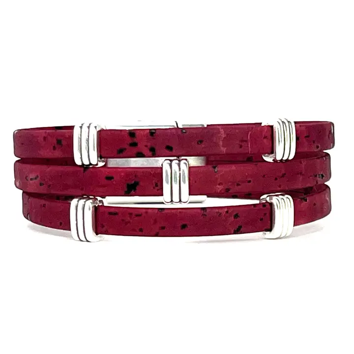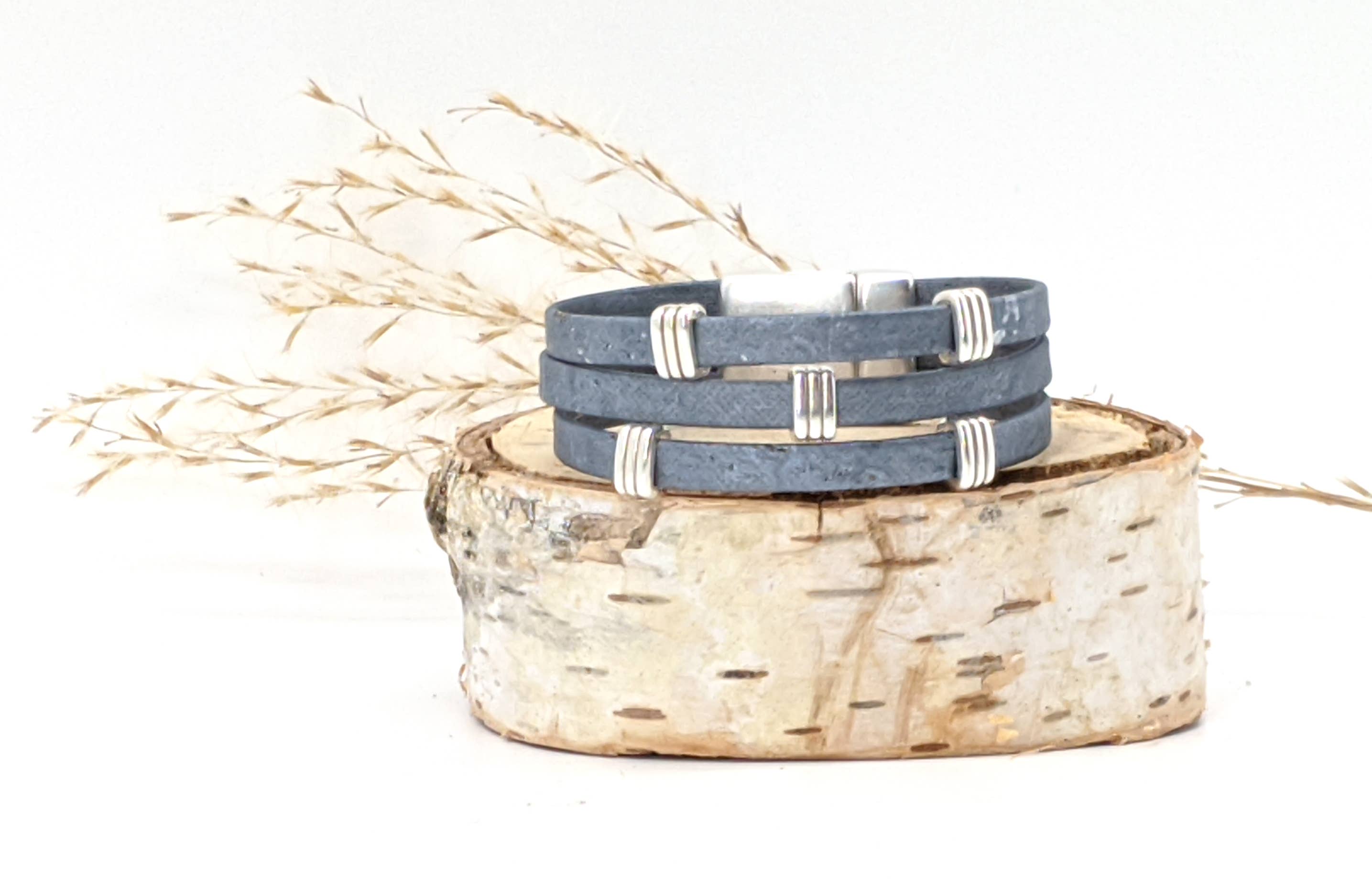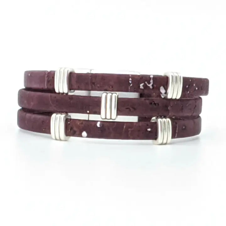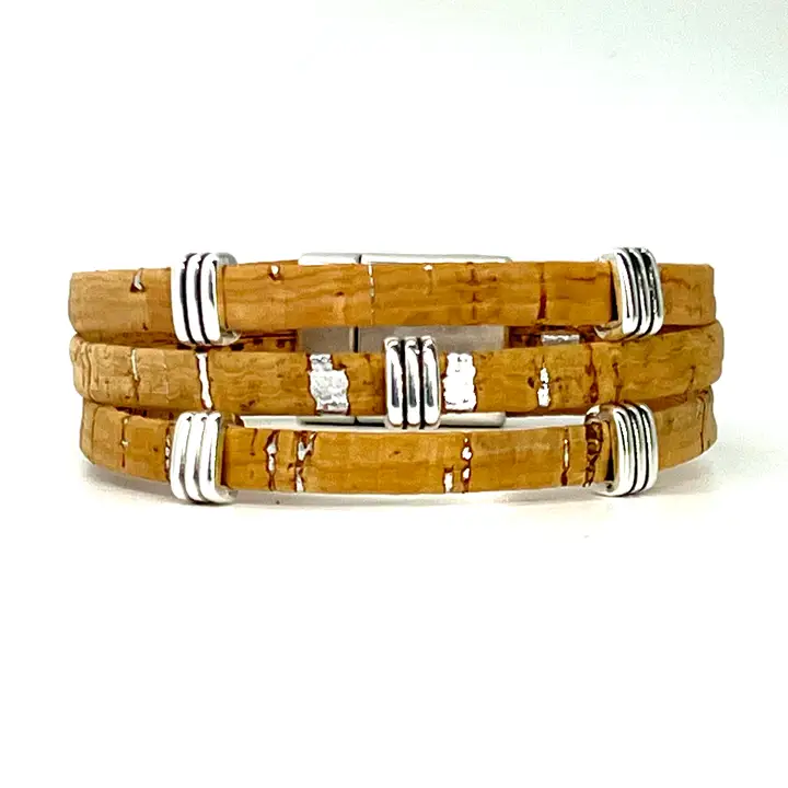 Three strands of Portuguese Cork Bracelet with antique silver accents and magnetic clasp (15mm wide) create a bold statement piece. Available in three sizes: Small: 6 1/2” finished length Medium: 7” finished length ** Large: 7 1/2” finished length ** Most popular size Cork is used as a vegan substitute for leather in a wide range of products including jewelry. Cork is a natural material, therefore each item will be unique.