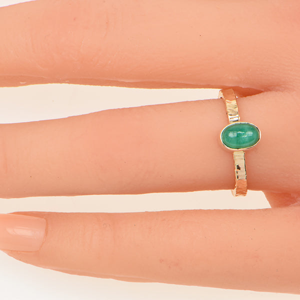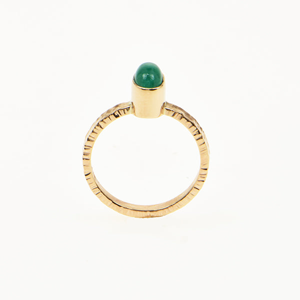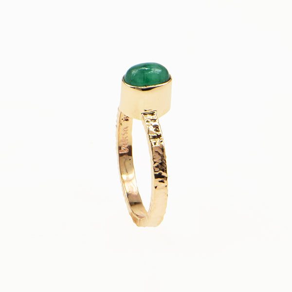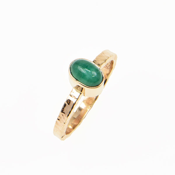 Emerald with a very bright forrest green color. Bezel setting, forged band, hammer textured on three sides.