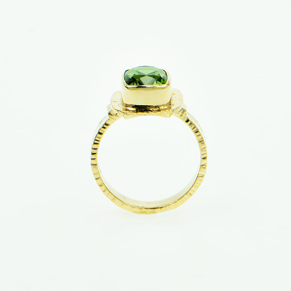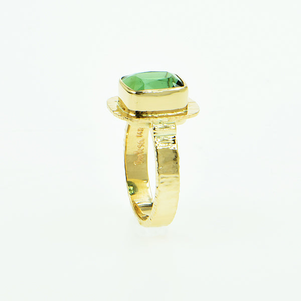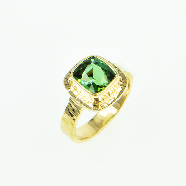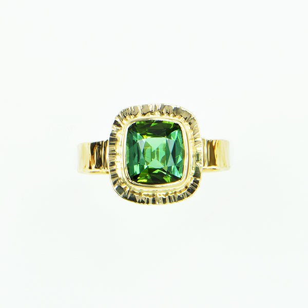 Afghan Tourmaline is cushion cut and emerald in color. Bezel setting with hammered frame, forged band, hammer textured on three sides. Design Details GOLD - 14k yellow GEMSTONE - Afghan Green Tourmaline CUT - Cushion faceted CARAT - 3.00 ct. SIZE - 8x9 mm OA DIMENSIONS - Top 13x14 mm BAND WIDTH - 4 mm