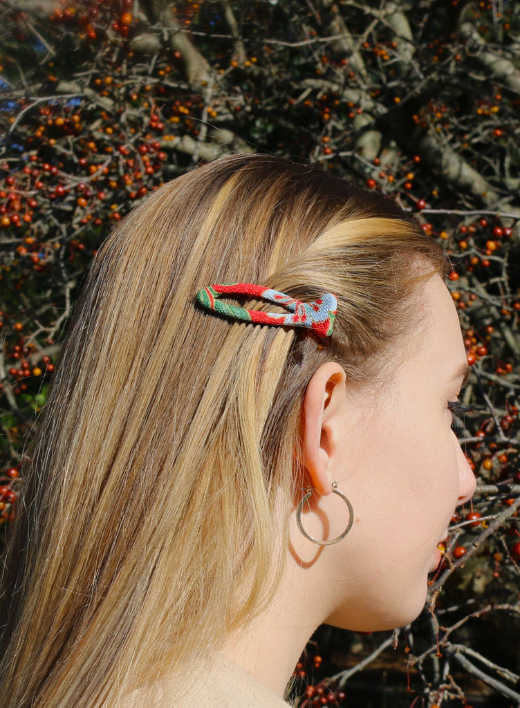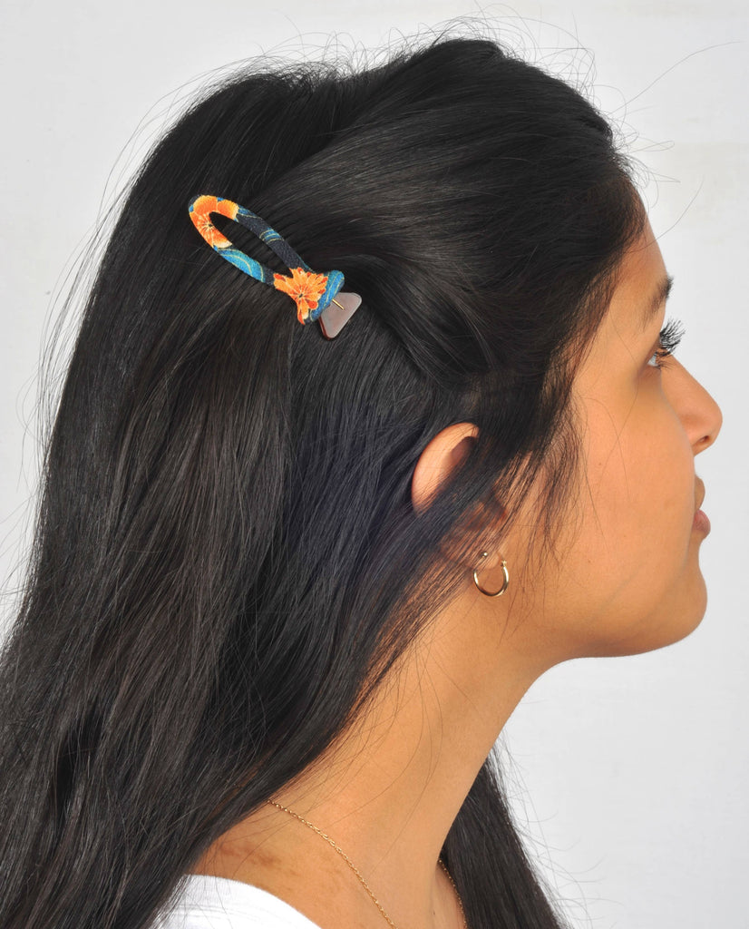 A sleek little clip for bangs. Floral clips come assorted. We will curate a balanced selection of colors and patterns for your order