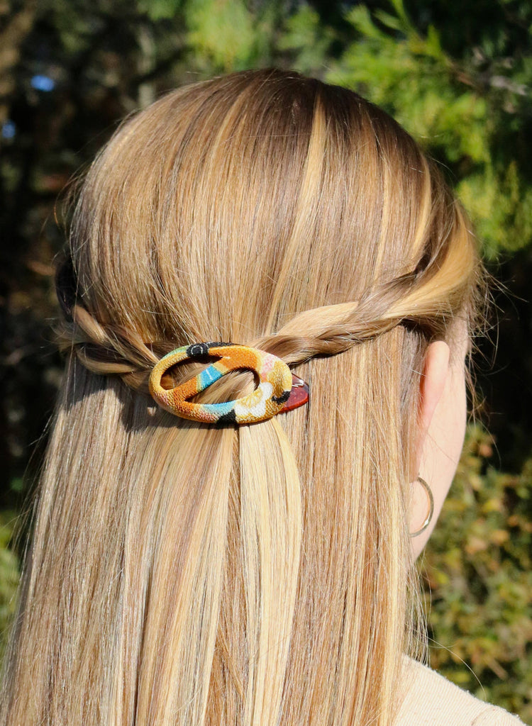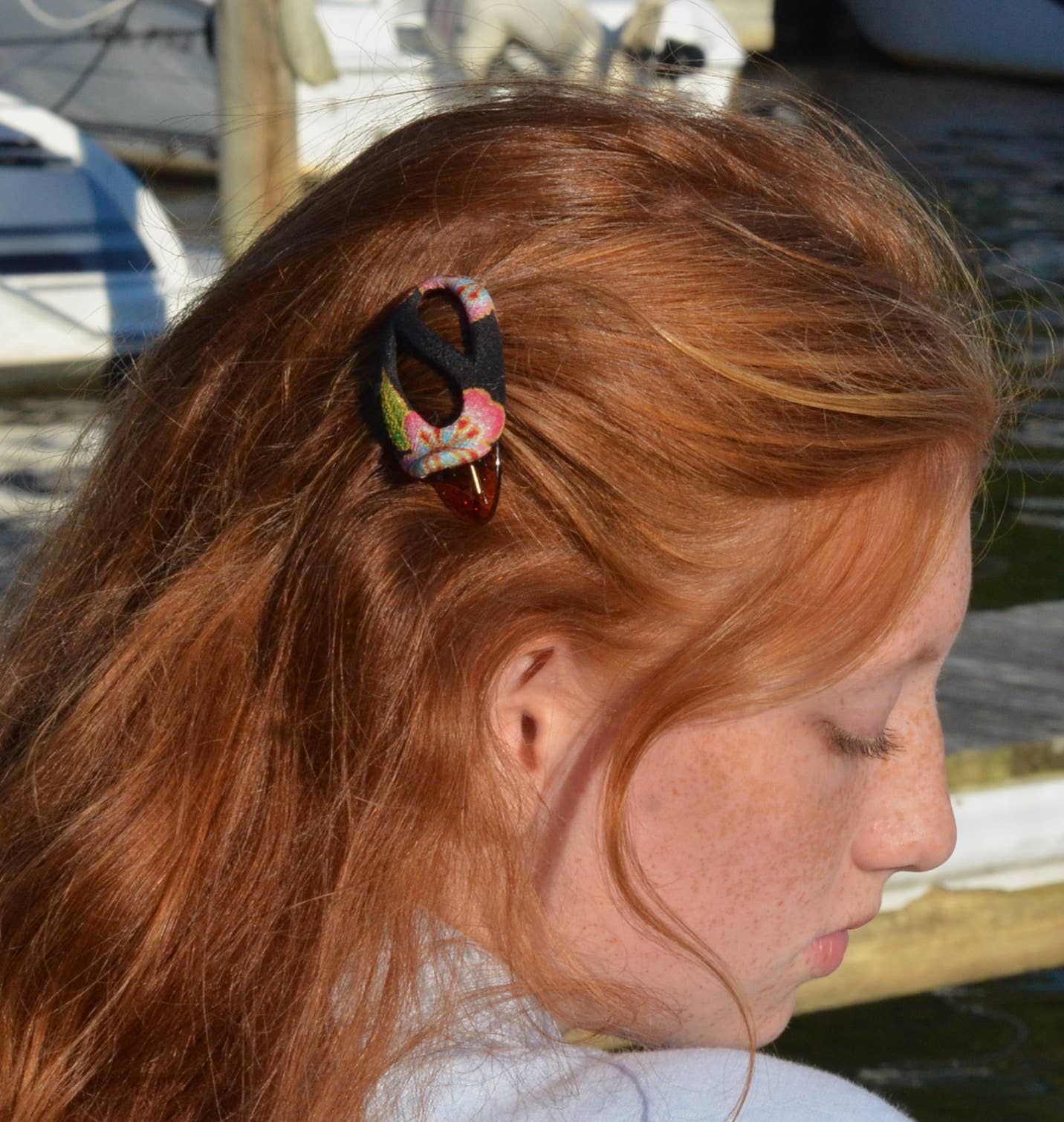 A Pretty and popular smaller clip. Oval Swirl can be used to create a partial pullback or for fine hair, a full updo. Floral clips come assorted. We will curate a balanced selection of colors and patterns for your order. Beginning 2024 Each clip will be packaged in an organza bag with care card making it an instant gift for your customers!