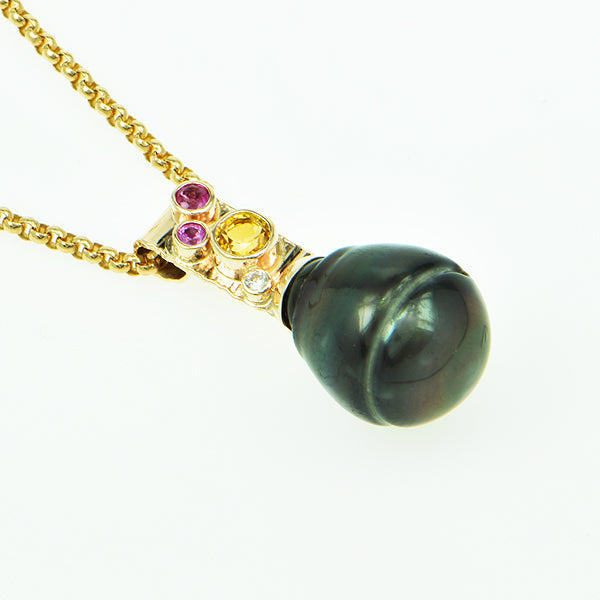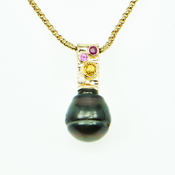 Yellow, Pink and Red Sapphires, accented by a Diamond form a color collage with a deep color Tahitian Circle Pearl with a natural "turned" shape. Bezel setting.
