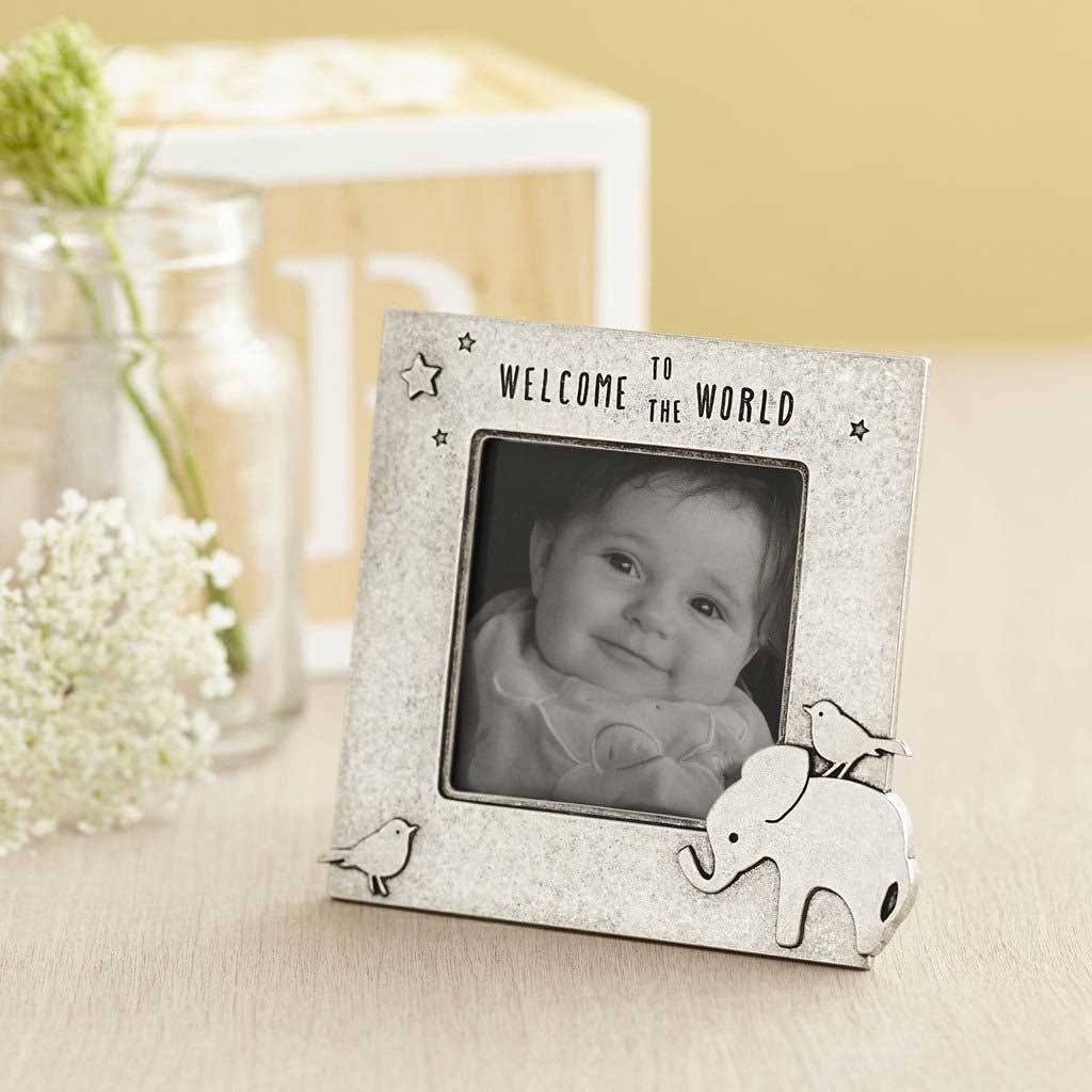 Welcome to the World! Our pewter baby frame features an elephant and cute little birdie friends. A fresh and modern version of a classic baby gift and a charming keepsake for a new baby or toddler, which may also be personalized with custom engraving.