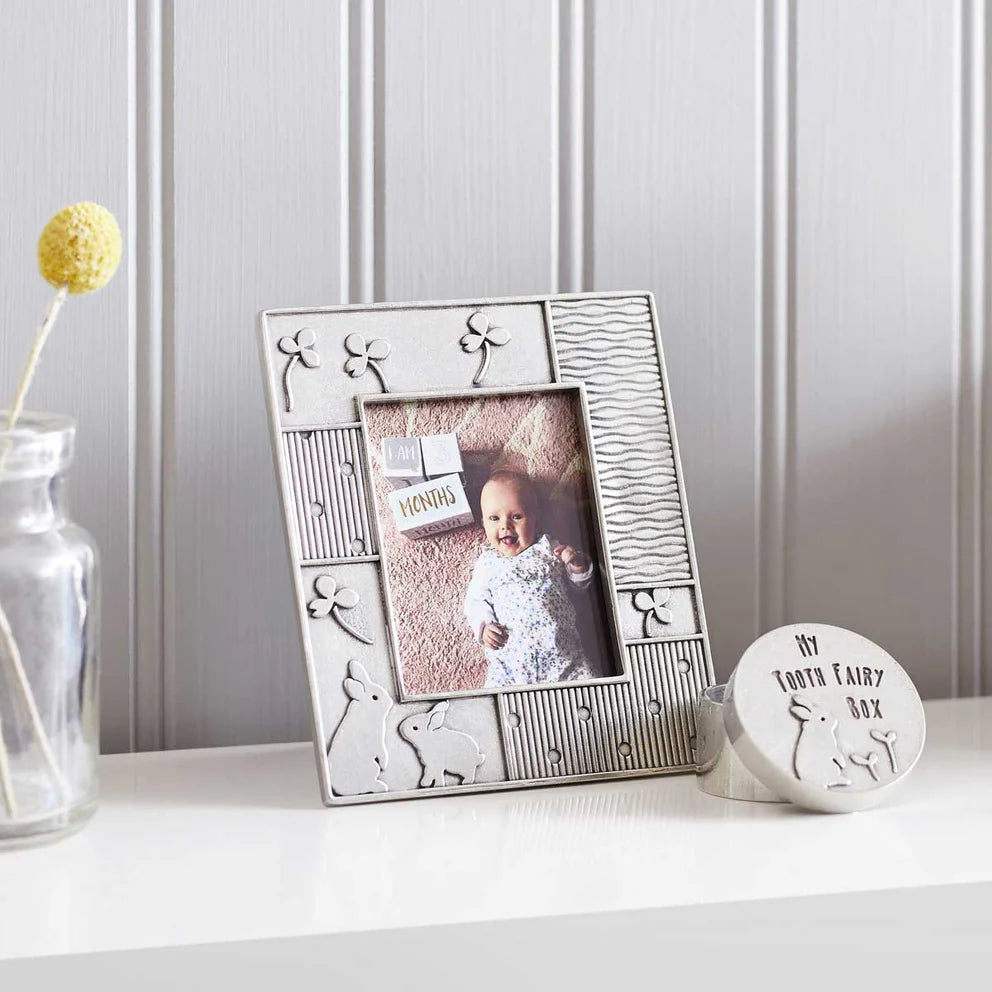 Inspired by heirloom baby quilts, our unique pewter baby frame features two bunnies and a sweet, modern patchwork design. Perfect for displaying a favorite photo in your baby's nursery! This frame also makes a charming keepsake gift for a baby or toddler. Measures 4.25 x 3.75 inches with an opening for a wallet size (3 x 2.5) photo. Coordinates with our rabbit baby spoons and baby cup.