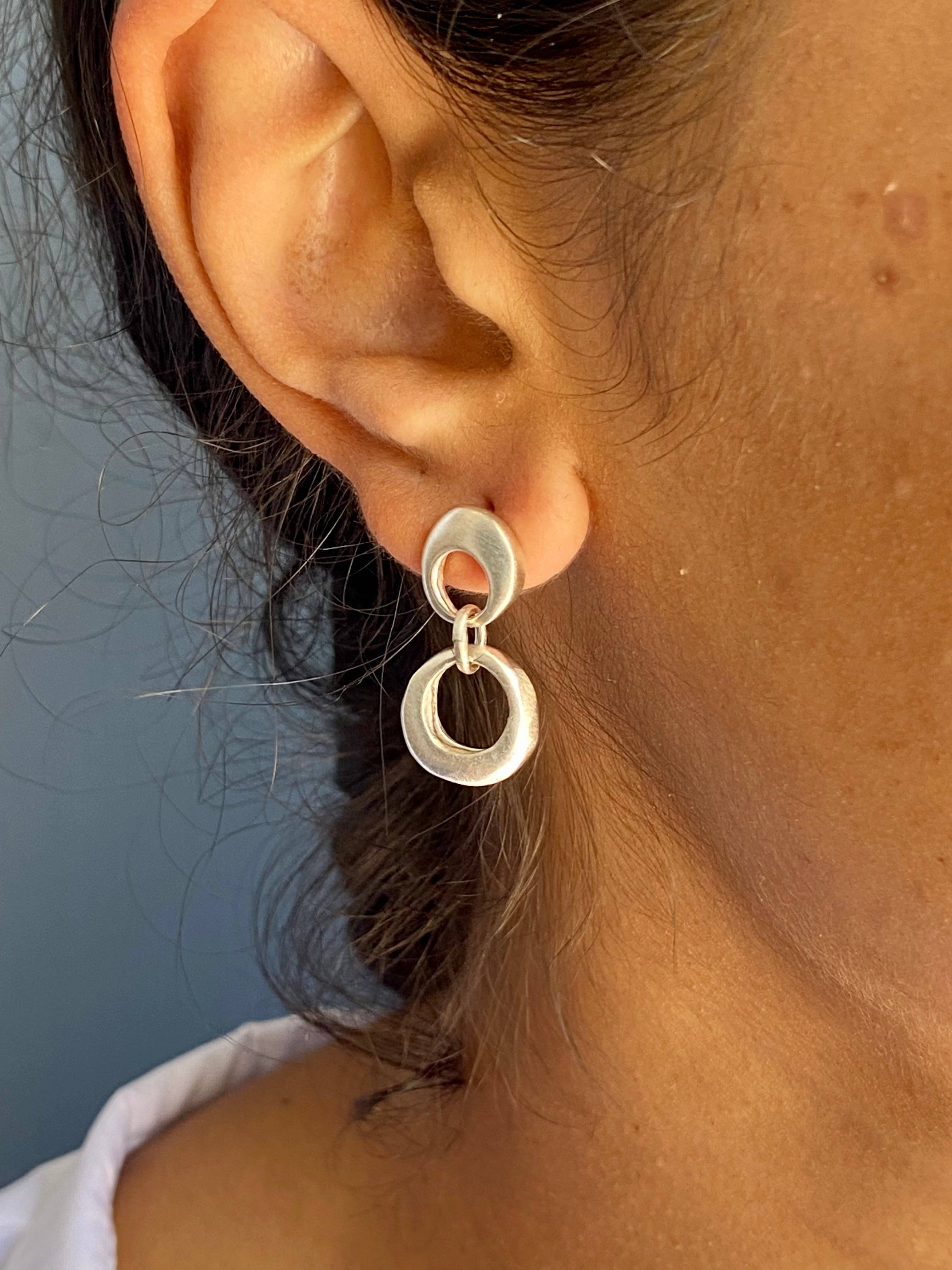 Double linked circles in sterling silver. Earrings Hang approximately 1". 569se Handmade in Oakland, Ca. • posts earrings • hangs 1” long • silver • silver posts