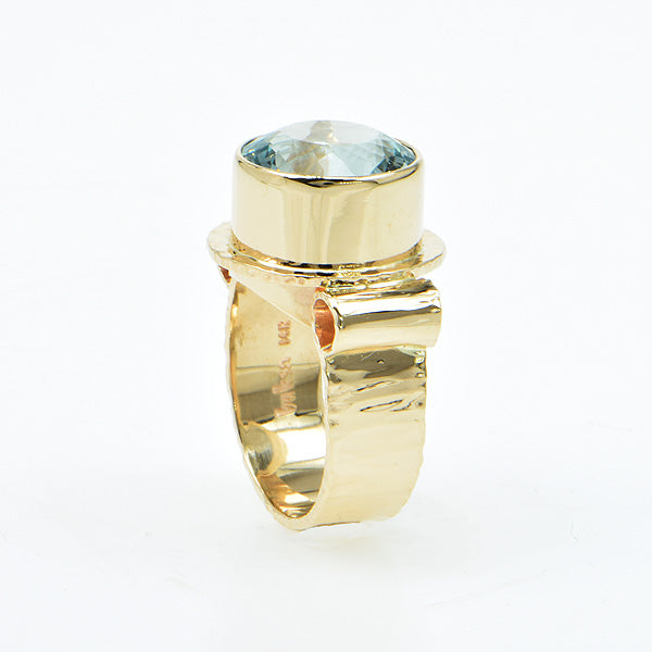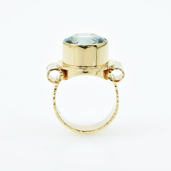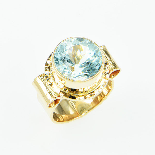 Aquamarine is normally heated to make it more blue. This unheated Aquamarine is truly the color of the ocean water for which it is named. Large rounds are unusual and this one is a beautiful flower-cut with facets on the bottom that resemble a chrysanthemum. Bezel setting with two hammered texture frames. Forged band, hammered texture on three sides.