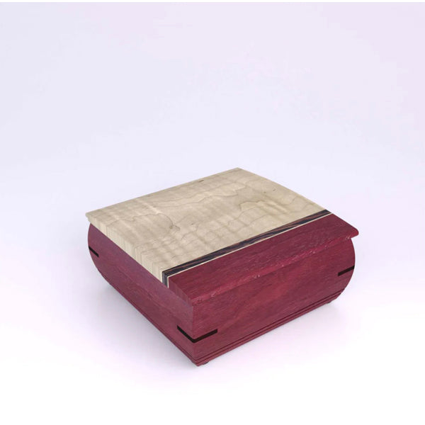 The Ring Bearer Box is made out of solid hardwood. The lid is hinged and features a lovely wood stripe across the front third of the lid. It also features hand cut corner splines, beautifully rounded sides and a double lined accent around the bottom.