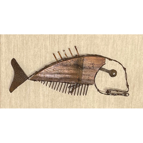 Most recently this art has manifested itself as whimsical fish sculptures created by using old tools, rusted or corroded metal, brass clock parts, as well as broken rudders and nautical items. These fish reflect an eye for symmetry as well as proportionality, each new piece carefully added after being selected from a collection of rusty castoffs. Each assemblage is deliberately left in a raw unpolished state with sharp points and edges clearly exposed. After several pieces being well received at a Helltown Gallery showing he became encouraged to continue pursuing this vein of expression. Each fish is unique in its size, shape, and composition, as well as the stories behind some of their parts.