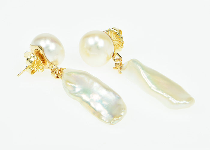 Free-form Freshwater Pearls hang below large Freshwater Button Pearls. Fantastic luster and soft shapes.