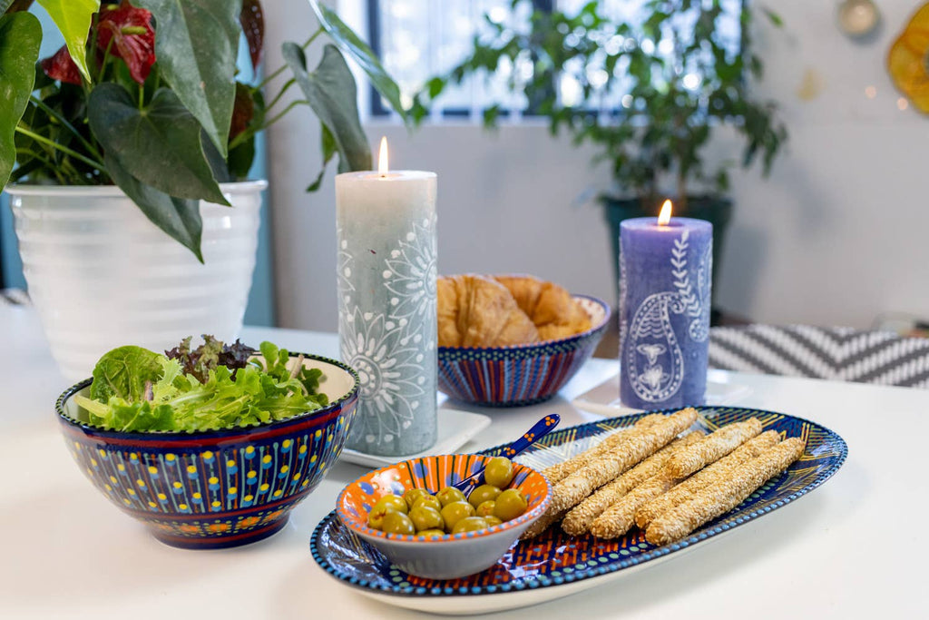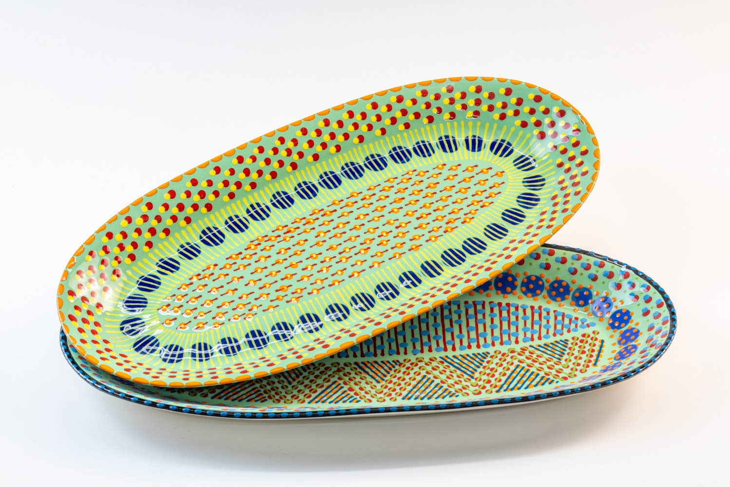 This beautiful ceramic platter is an ideal size for serving at the table and an eye catcher on display in your kitchen! 15.5" x 7.4" X 1.5" in size. Handmade and hand painted by the artisans at Potterswork in a small community just outside Cape Town, South Africa. The platter is dishwasher & microwave safe. Available in 7 base colors; Baby Blue, Indigo, Jasper Green, Lime Green, Orange, Yellow and White. The Ceramic Mini Nut Bowl and Ceramic Small Spoon are perfect for serving a side sauce or condiment on the Platter! And fun to mix & match the colors.... Potterswork ceramics are individually hand crafted and hand painted -- which is what makes these ceramics so special. Please be aware that the pattern on the ceramic piece you receive may appear slightly different from the website photos, but will be consistent with the theme of the design.