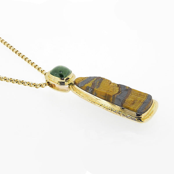 Rough Tiger Eye and Green Tourmaline Cabochon Pendant